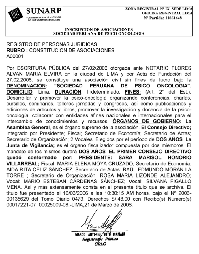 La SOCIEDAD PERUANA DE PSICO-ONCOLOGÍA obtuvo el acta de inscripción en la SUNARP el 27 de Febrero del 2006 y desde el 21 de Marzo inicia sus actividades. En la SUNARP tiene Registro N° 11861648 y es reconocida en el Colegio de Psicólogos del Perú con el Registro de Asociaciones con Rs. 070-06-CDN.